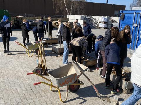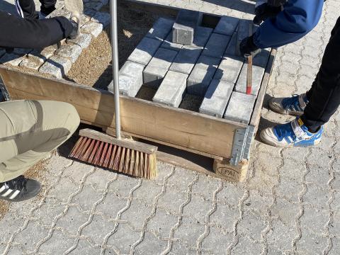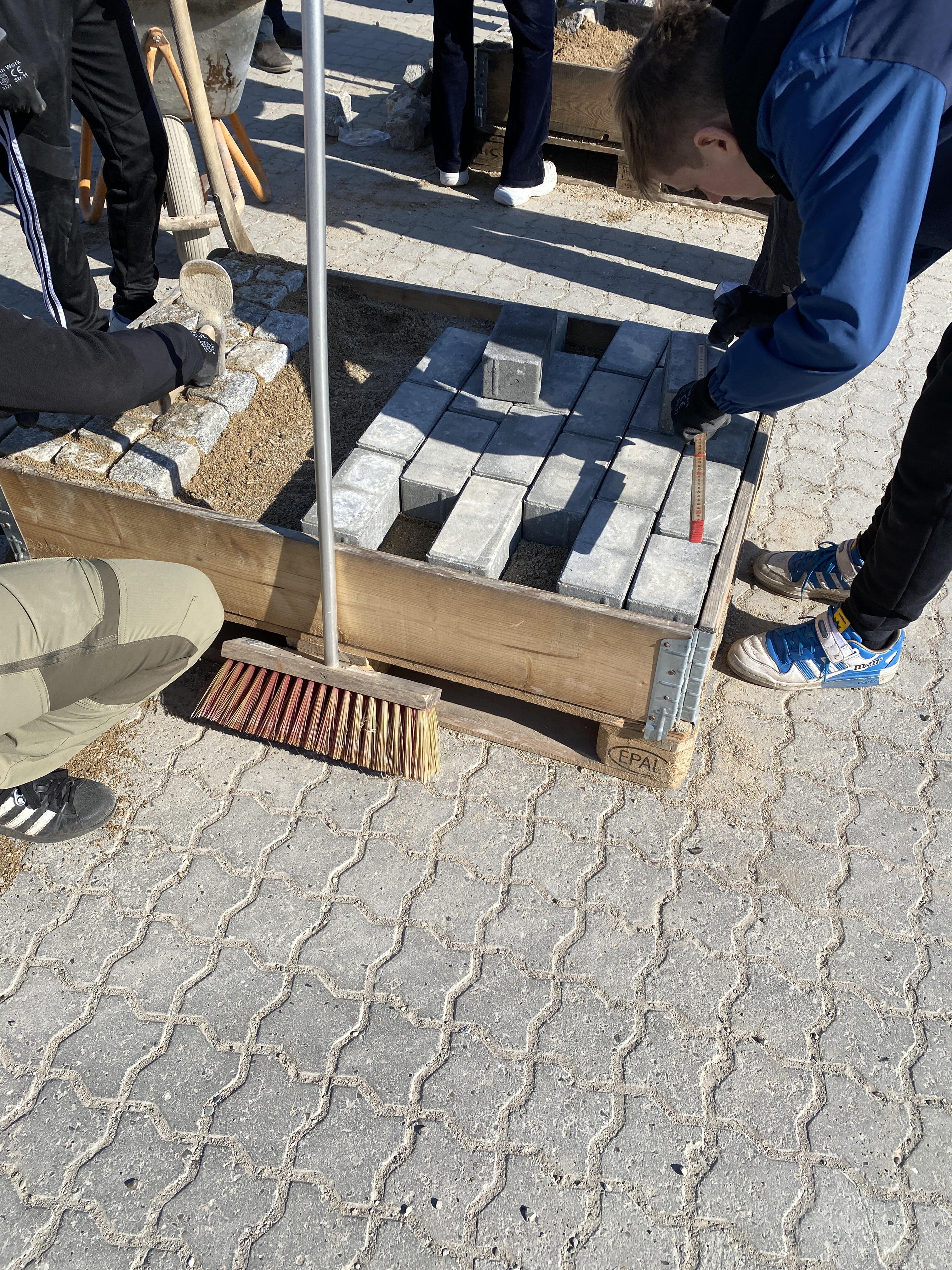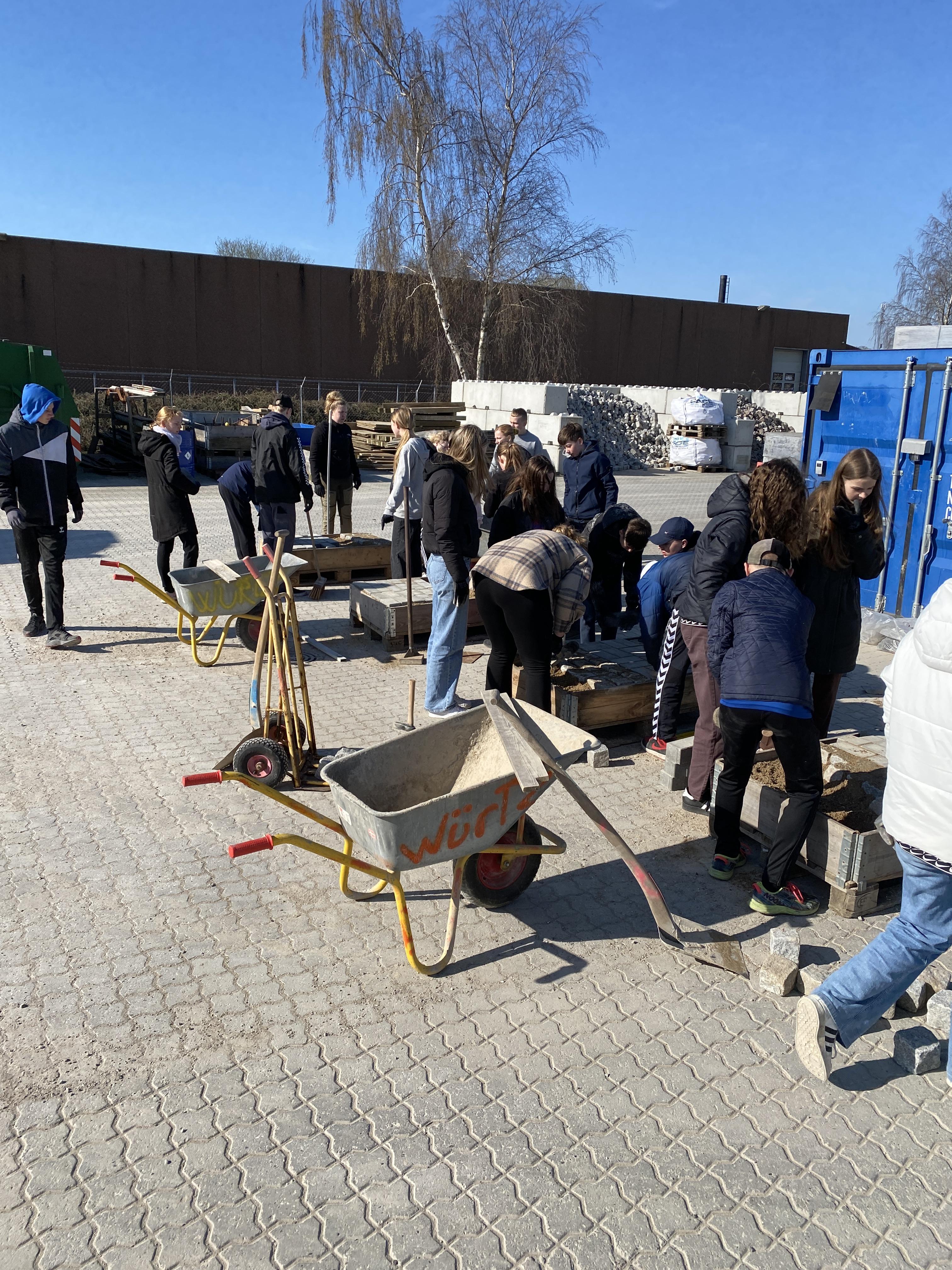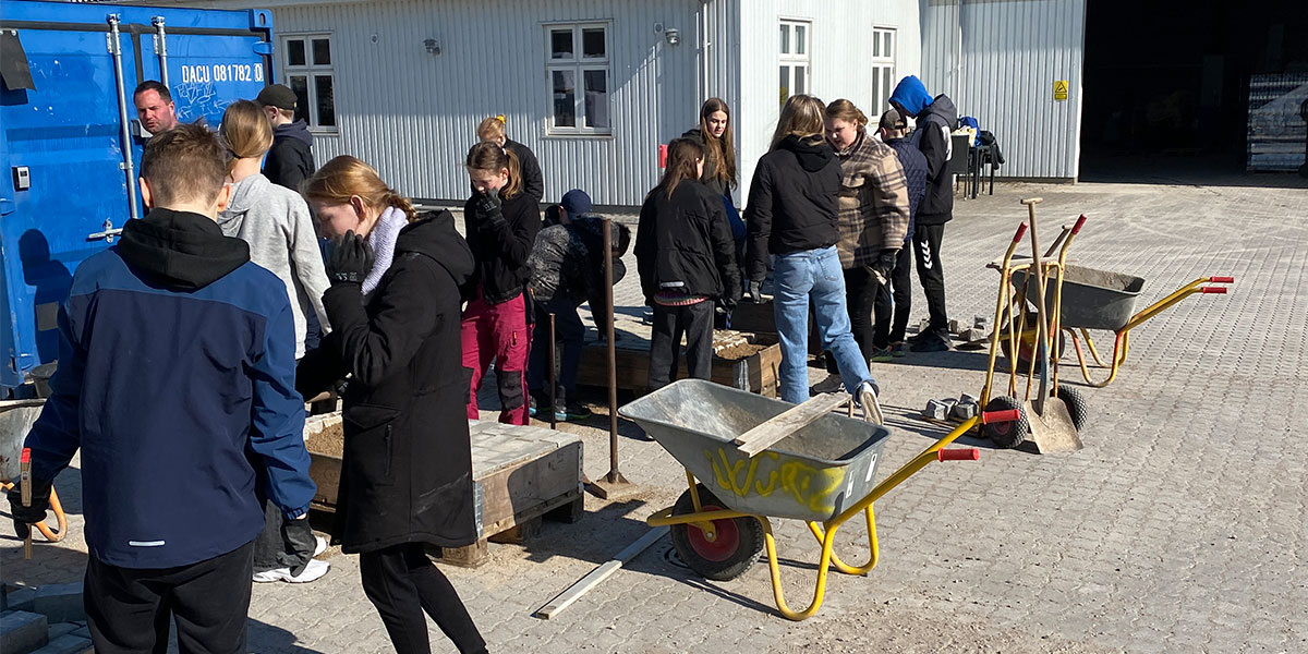 Alle eleverne fra 7. årgang var inviteret på virksomhedsbesøg hos Würtz Gruppen A/S. Her har de fået lov til at snuse til arbejdet som blandt andet brolægger, og der er god grund til, at bøgerne er skiftet ud med grus og fliser.